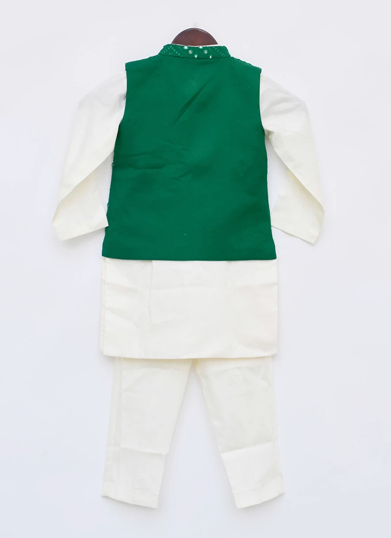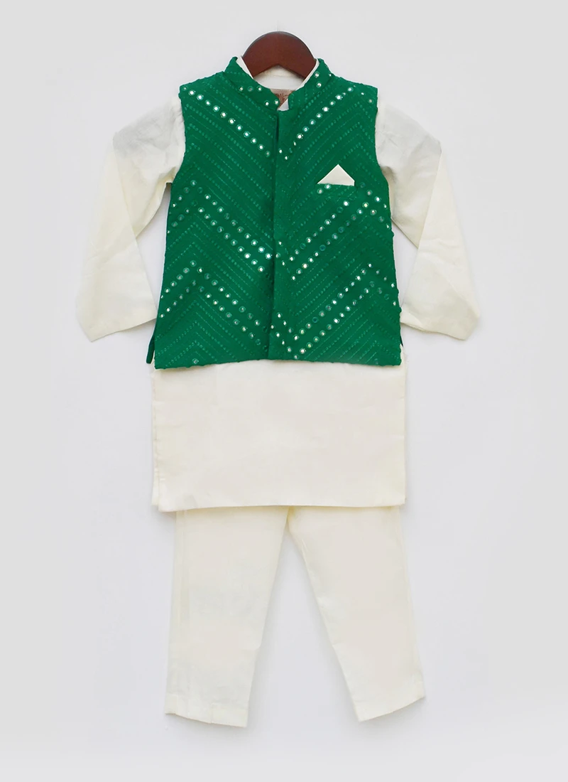 Make your boy stunning in this white cotton silk boys bandi set will make you stylish with full sleeves and mandiran collar neckstyle looks chic. This set comes with white cotton silk straight pant bottom and with green silk with mirror embroidered work nehru jacket.
