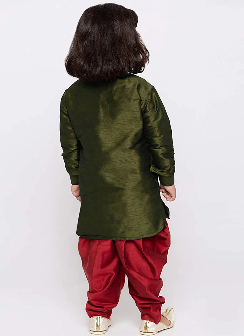 Your child look Pretty in this green dupion silk kurta pyjama. The plain work appears to be like chic and best for festival. Comes with dupion silk bottom.