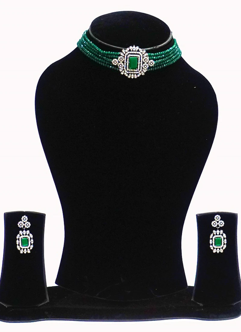 The green stones used in this necklace set are carefully selected for their rich colour and exceptional clarity radiating a mesmerizing aura. These stones are expertly cut and polished to maximize their brilliance creating a captivating visual effect that is sure to turn heads. The deep green hues of the stones are reminiscent of lush forests and evoke a sense of timeless beauty and grace.
