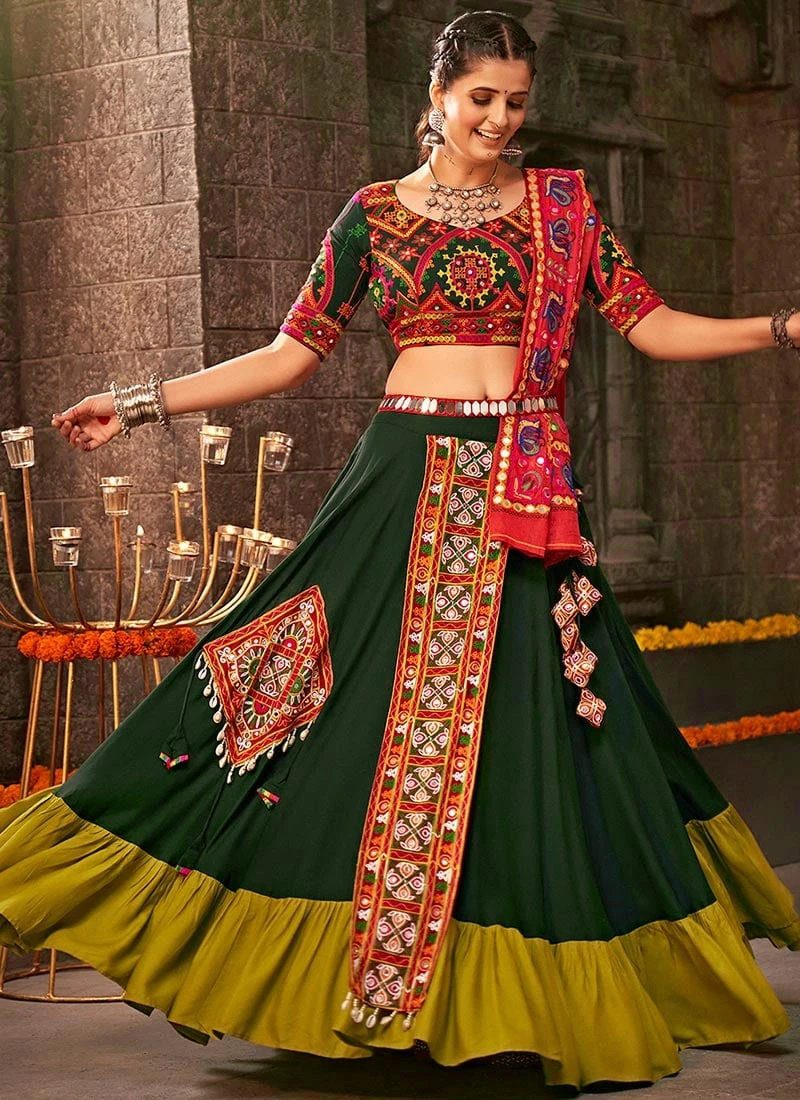 Transport yourself to a world of vibrant colors intricate craftsmanship and timeless tradition with our Green Viscose Printed Kutch Work Chaniya Choli. This exquisite ensemble is a celebration of Indian culture and artistry perfectly blending contemporary style with the rich heritage of Kutch embroidery. Whether youre gearing up for a festive occasion a traditional wedding or a cultural event our Chaniya Choli is your goto attire to make a statement and exude elegance.