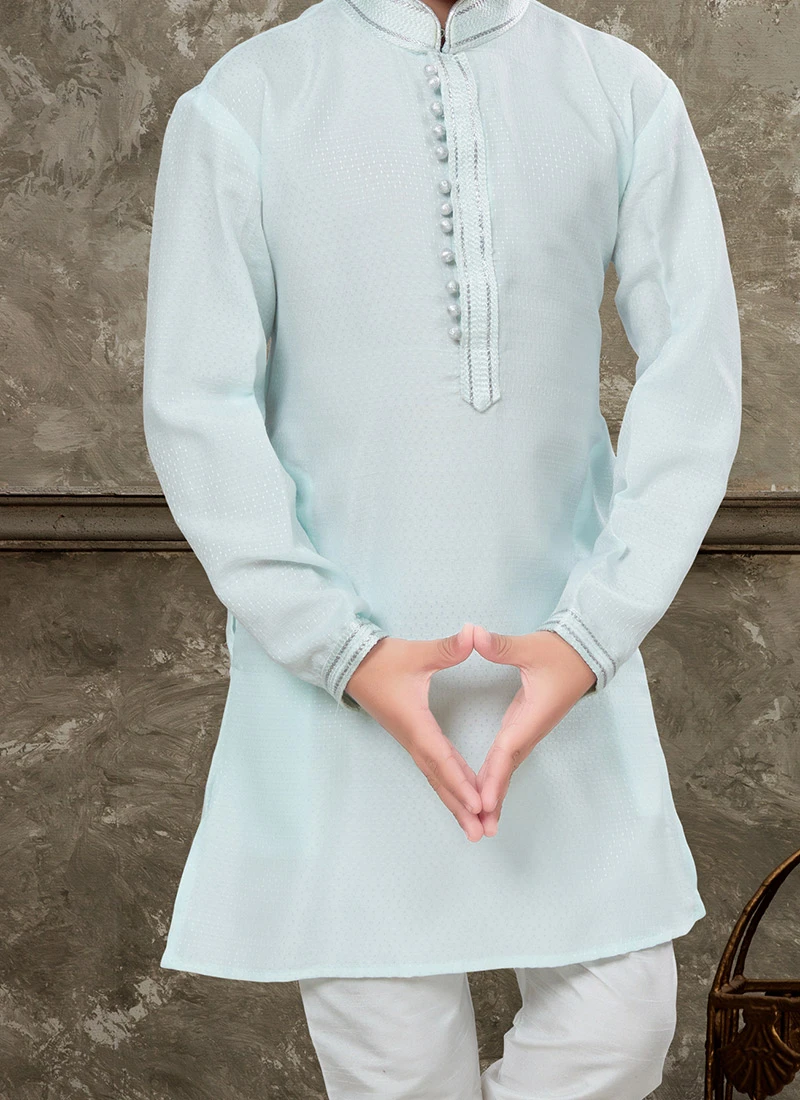 Crafted from highquality art silk fabric this kurta pyjama set boasts a luxurious look and a soft comfortable feel against the skin. The fabric has a subtle sheen that adds an element of sophistication to the outfit.