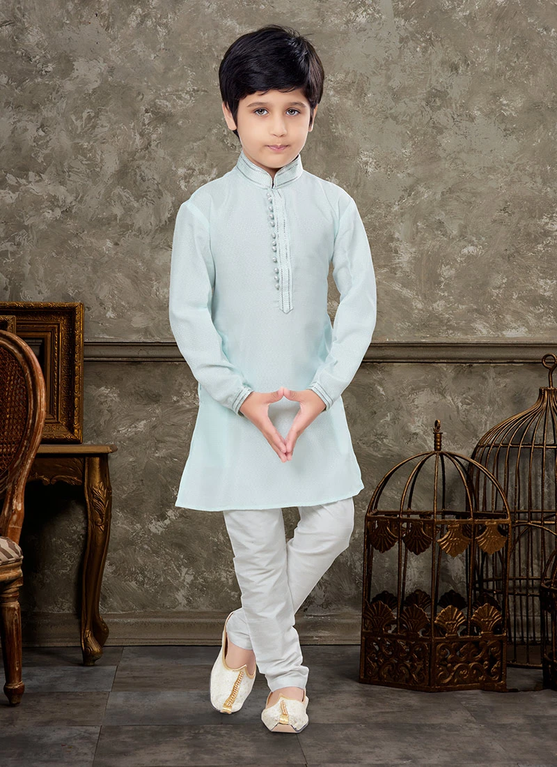 The accompanying pyjama is tailored for comfort and style. It has a relaxed fit and an elastic waistband ensuring a snug and comfortable fit for your child. The grey color of the pyjama complements the kurta perfectly.