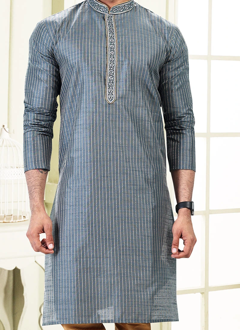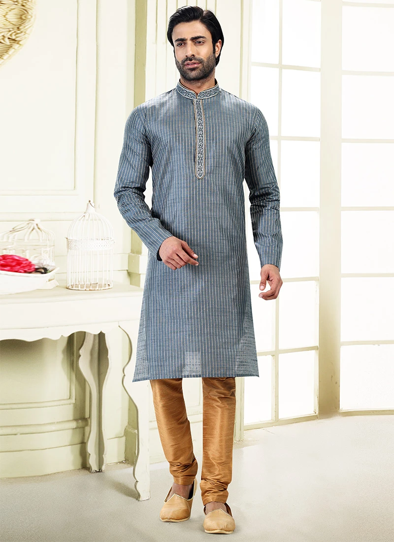 Create an impression adorning this readymade grey art silk kurta pyjama enriched with striped designs over the kurta and crafted with full sleeves and mandarin collar neckstyle is representing a royalty in itself. This Kurta pyjama comes with chikoo art banarasi silk chudi bottom.
