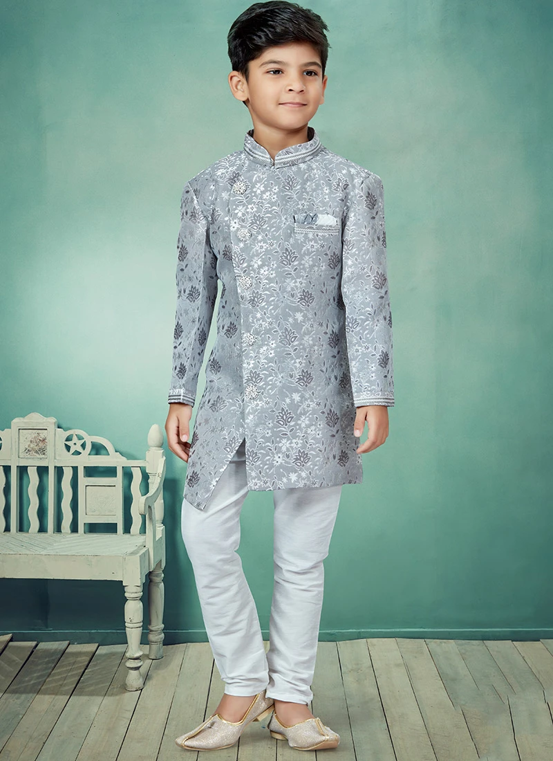 Be the first to review “Grey Banarasi Silk Jacquard Indowestern Sherwani Party Wear” Cancel reply