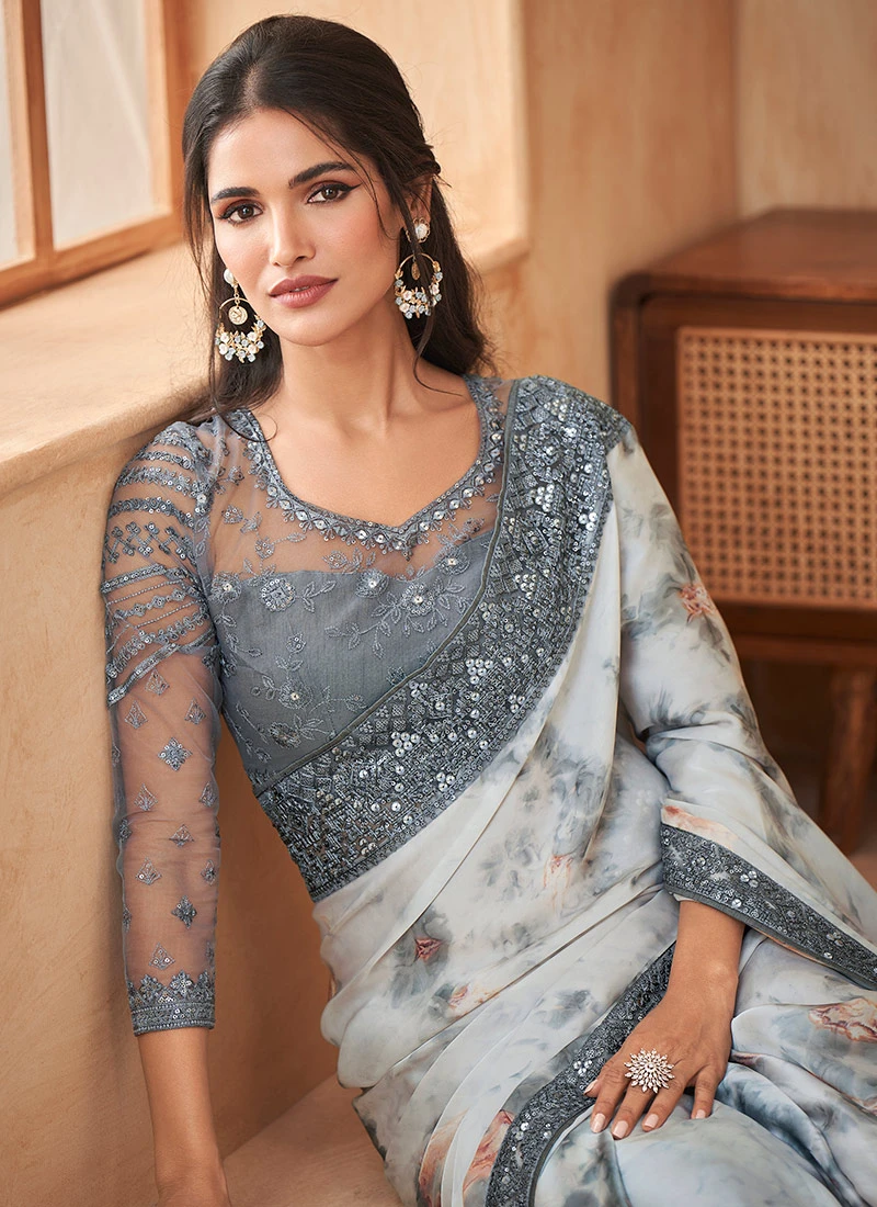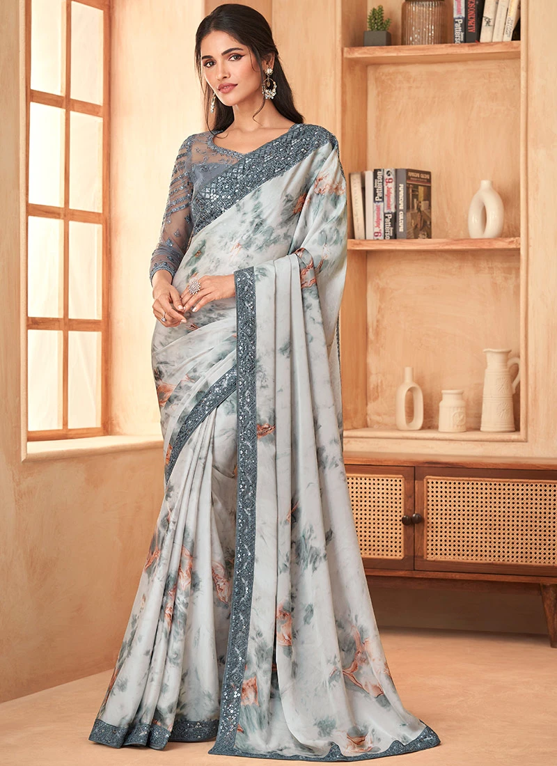 This Grey Satin Georgette Embroidered Saree comes with a matching blouse piece allowing the wearer to customize the blouse according to their preferences. The blouse piece is designed to complement the saree featuring similar embroidery patterns and detailing creating a cohesive and harmonious look when worn together.
