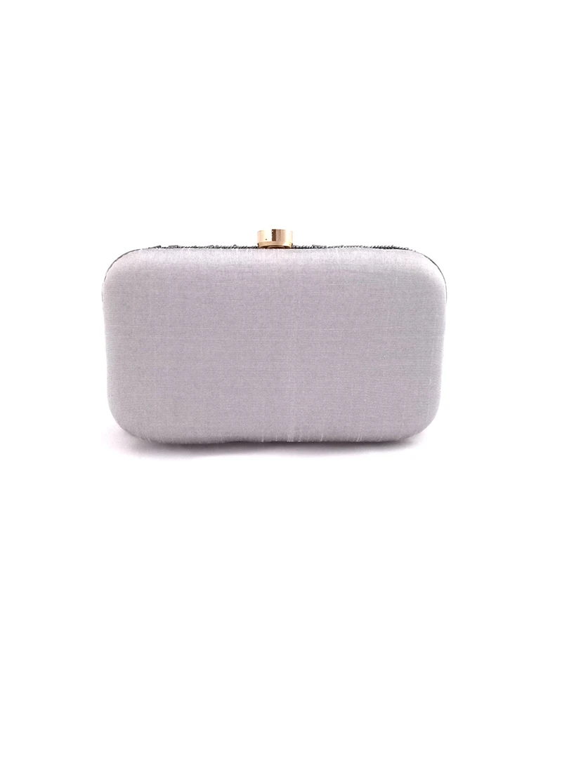 The grey silk designer clutch decorative hand embroidered with bugle beads work on one side and comes with long sling chain.
