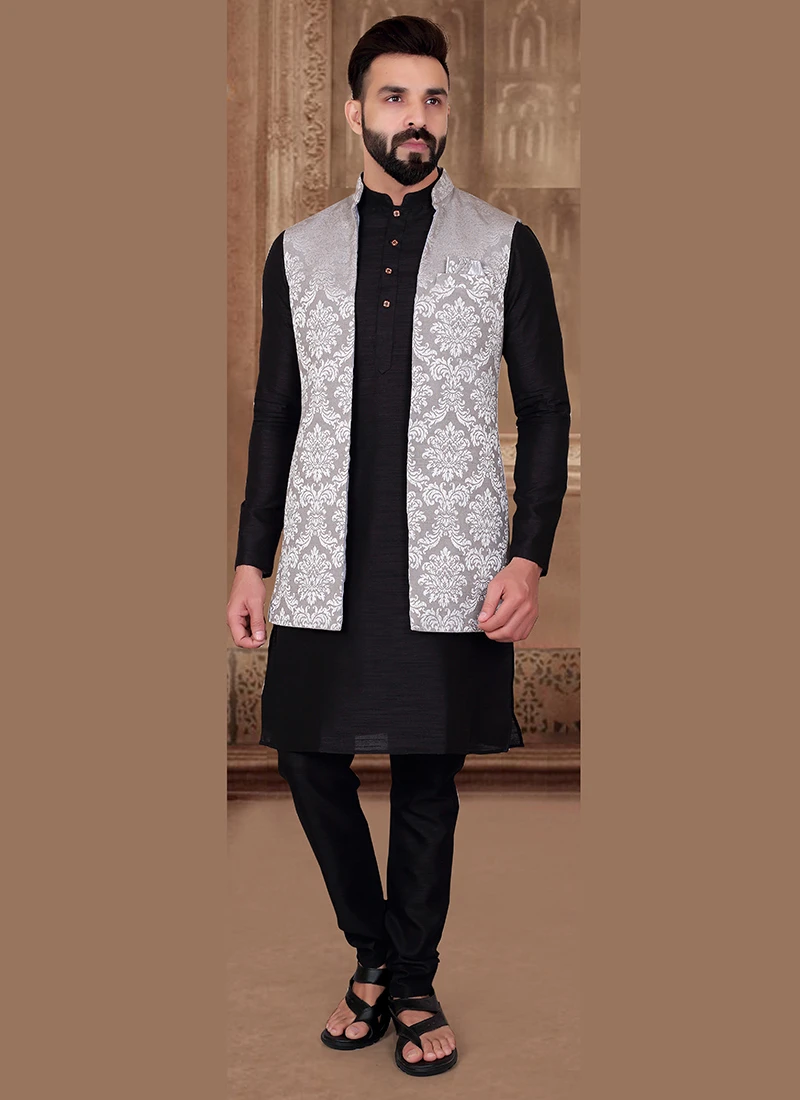 True style will come out of your dressing style and design with this grey silk long nehru jacket and crafted with mandarin collar neck and sleeveless enriched with jacquard work is representing royalty in itself.