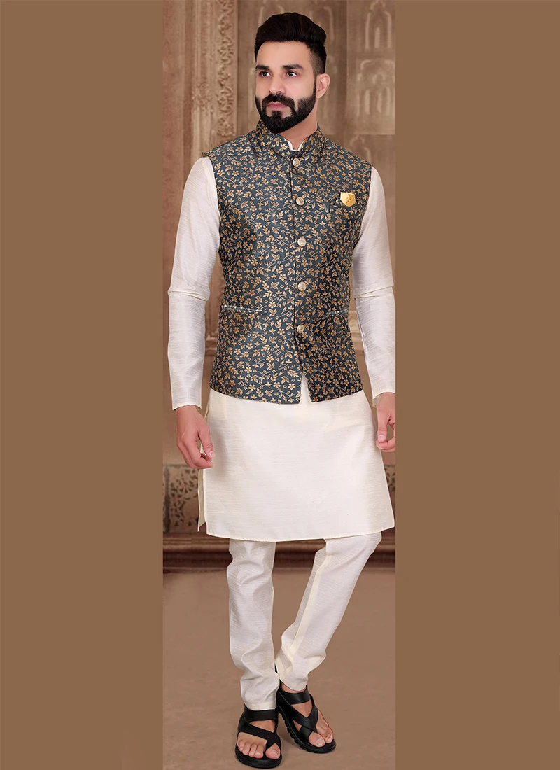 Be your own style icon in this grey silk nehru jacket crafted with mandarin collar neck and sleeveless enriched with jacquard work is representing royalty in itself.