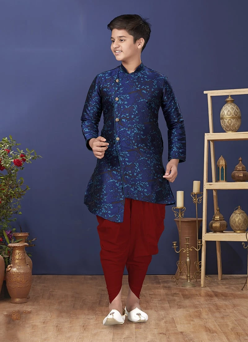 Add a vibrant burst of colour with your wardrobe with this indigo blue jacquard silk boys indowestern sherwani enriched with jacquard work over the sherwani crafted with full sleeves and mandarin collar neckstyle is representing a royalty in itself. This sherwani comes with maroon dupion silk dhoti pant bottom.
