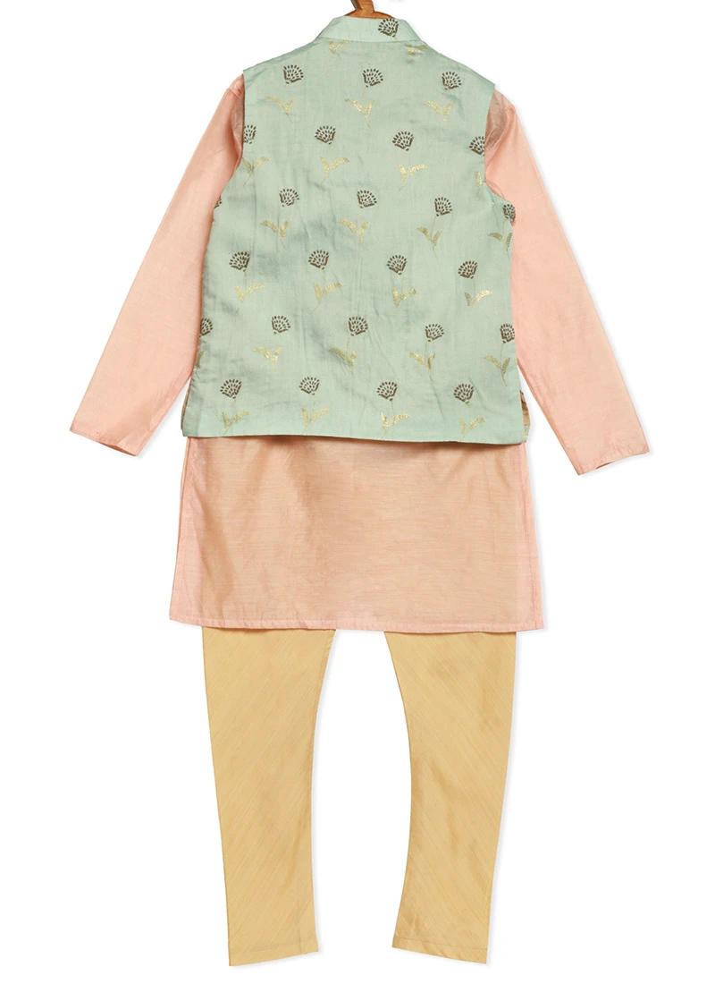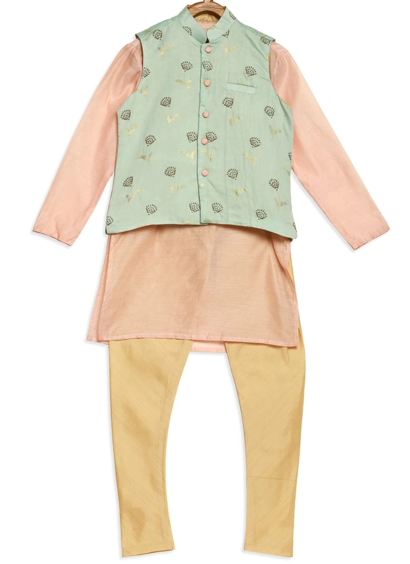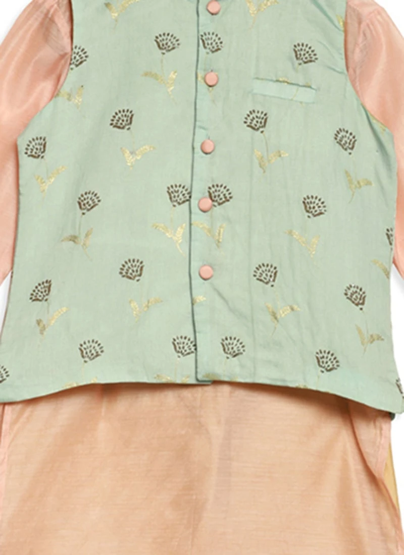 Presenting a green foil print jacket with pink taffeta kurta and narrow churidar pant, jacket featured collar neckline, sleeves less, length till hip with front opening, kurta featured close round neckline, full sleeves, slits start from thigh level comes with front gaja button opening, knee-length. It’s paired up with white churidar pant with a drawstring opening. Mask only for shoot purposes.Refer the fabric image for true color of the dress. This dress is custom designed from fabric and custom stitched. Once sold cannot be returned.Designs, colors, and patterns on the actual product may slightly vary from designs shown in the image. Images are the only representative