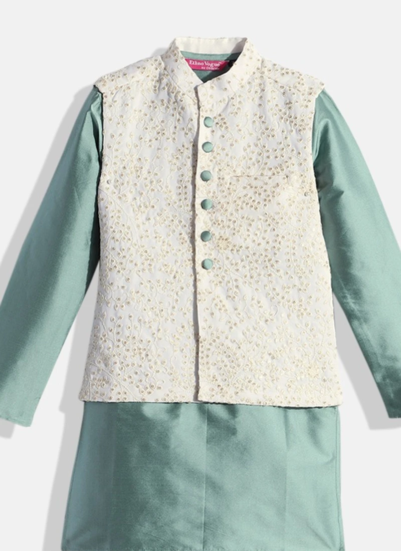Be the first to review “Kids Boys Green Tafetta Kurta N White Embroidered Festive Wear” Cancel reply