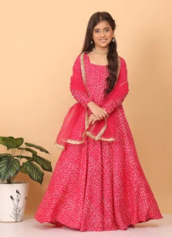 Dupatta From Kids Girls Pink Bandhani Printed Rayon Gown With Dupatta Set After Six Wear