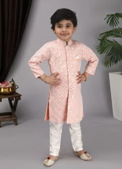 Peach Art Silk Embroidered Kids Boys Achkan Sherwani Party Wear