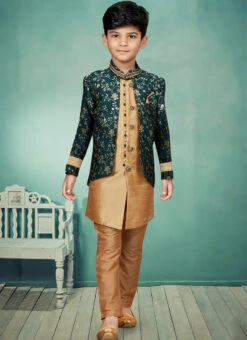 Cream And Green Art Silk Jacquard Indowestern Sherwani Party Wear