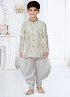 Cream Jacquard Silk Printed Work Indowestern Sherwani Party Wear