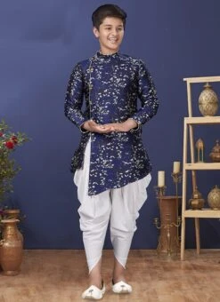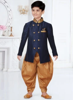 Navy Blue Jacquard Silk Boys Indowestern Sherwani Party Wear