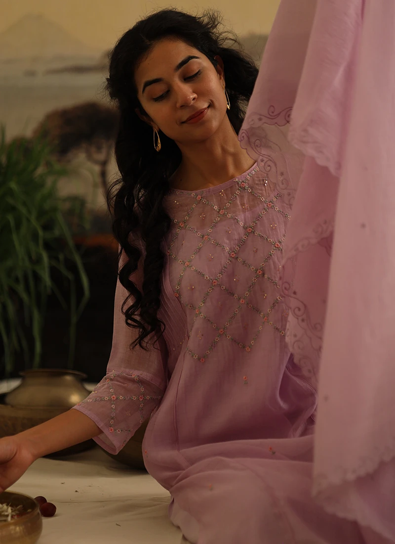 Introducing the elegant Lavender Chanderi Silk Embroidered Dupatta the perfect accessory to enhance your party wear ensemble for special occasions and festive celebrations. This exquisite dupatta seamlessly combines traditional charm with contemporary style making it an ideal choice for events like Bhai Duj Diwali Eid Pongal Raksha Bandhan and various other joyous gatherings.Crafted with utmost precision and artistry this dupatta exudes a sense of grace and sophistication. The Lavender chanderi silk fabric lends it a luxurious feel elevating your outfit to new heights of elegance. The smooth and lightweight texture of chanderi silk drapes effortlessly adding a touch of regality to your overall look.Adorned with intricate embroidery this dupatta showcases delicate patterns that reflect the rich cultural heritage of India. The embroidery work features fine threadwork sequins and zari adding a subtle shimmer to the ensemble. These ornate embellishments not only enhance the visual appeal of the dupatta but also infuse it with a sense of timeless beauty and glamour.The Lavender hue of the dupatta symbolizes purity and serenity making it a versatile accessory that complements a wide range of party wear outfits. Whether youre wearing a traditional salwar kameez an elegant lehenga or a chic fusion ensemble this dupatta effortlessly adds a touch of sophistication and completes your look with finesse.The generous size of the dupatta allows for various draping styles offering you the freedom to experiment and create your own unique fashion statement. Drape it gracefully over your shoulders or let it cascade down your arms for an ethereal look that exudes grace and charm.Whether youre attending a vibrant Diwali celebration a joyous Eid gathering a colorful Pongal festival or celebrating the bond of love on Raksha Bandhan the Lavender Chanderi Silk Embroidered Dupatta is the perfect companion. It adds a touch of elegance and enhances the festive spirit of any occasion making you feel like the epitome of grace and style.Pair this stunning dupatta with your favorite party wear outfit complement it with statement jewelry and matching accessories and get ready to make a lasting impression. With the Lavender Chanderi Silk Embroidered Dupatta youre sure to shine bright and create cherished memories at every festive event.