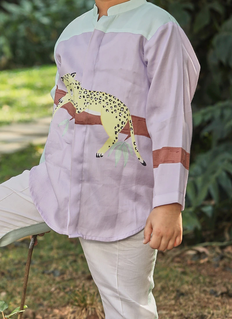 Look stylish adorning in this lavender and green color pure cotton shirt enriched with animal printed work over the dress and crafted with collar neck and full sleeves look pretty. Comes with off white pure cotton pant bottom.