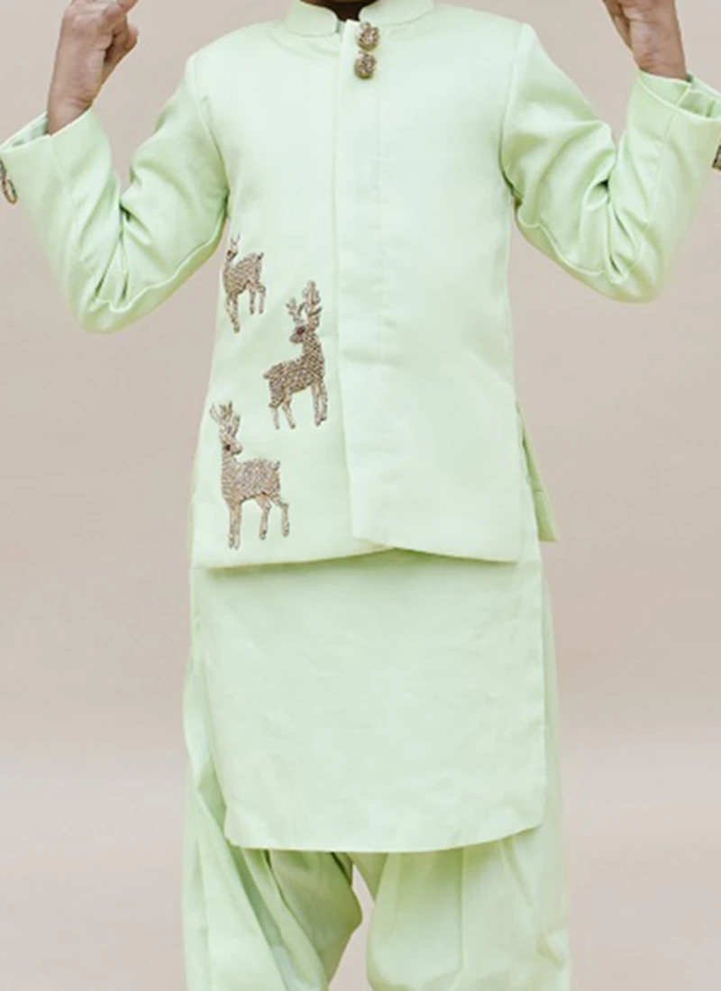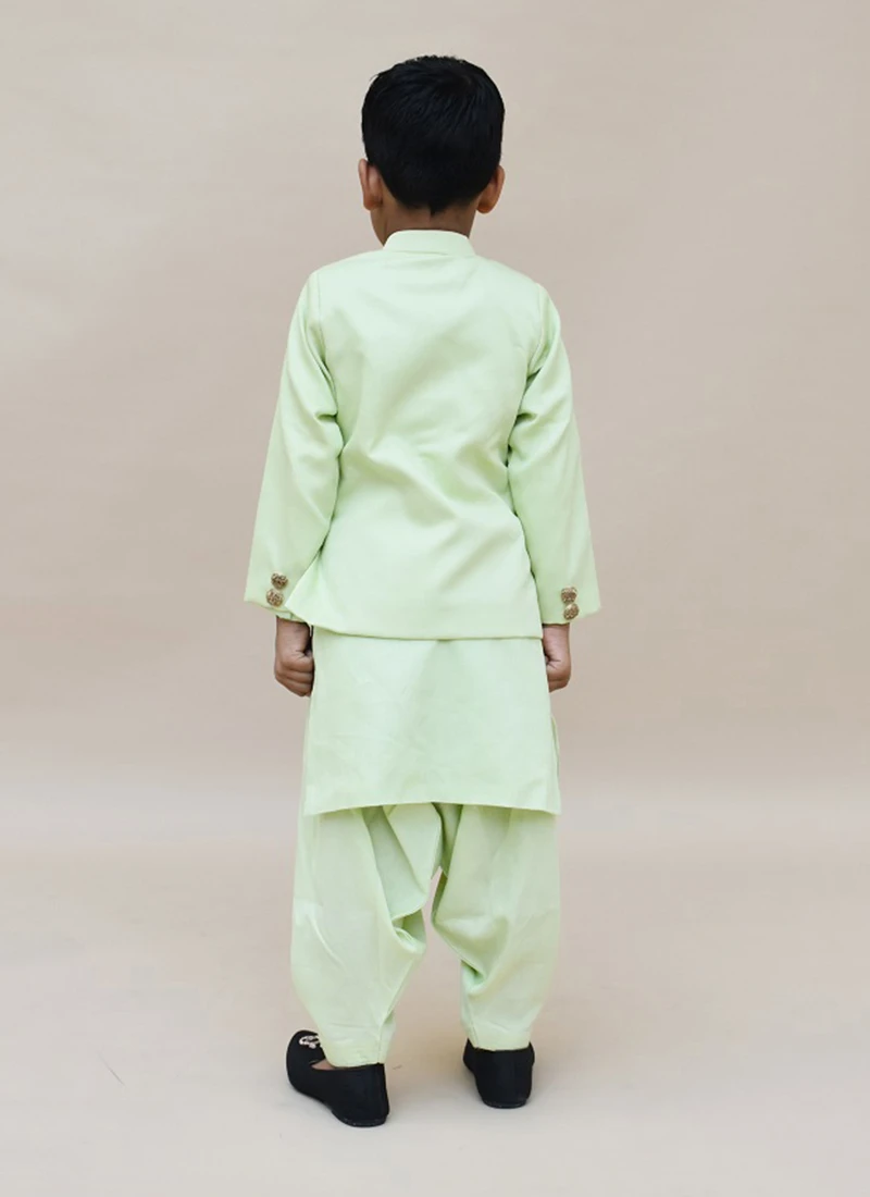 Make your boy look charm in this light green cotton silk boys bandi set will make you stylish and graceful. It crafted with full sleeves and mandiran collar neckstyle looks chic and ideal for any affair. This set comes with light green cotton silk salwar pant bottom and with light green cotton with embroidered motifs work.