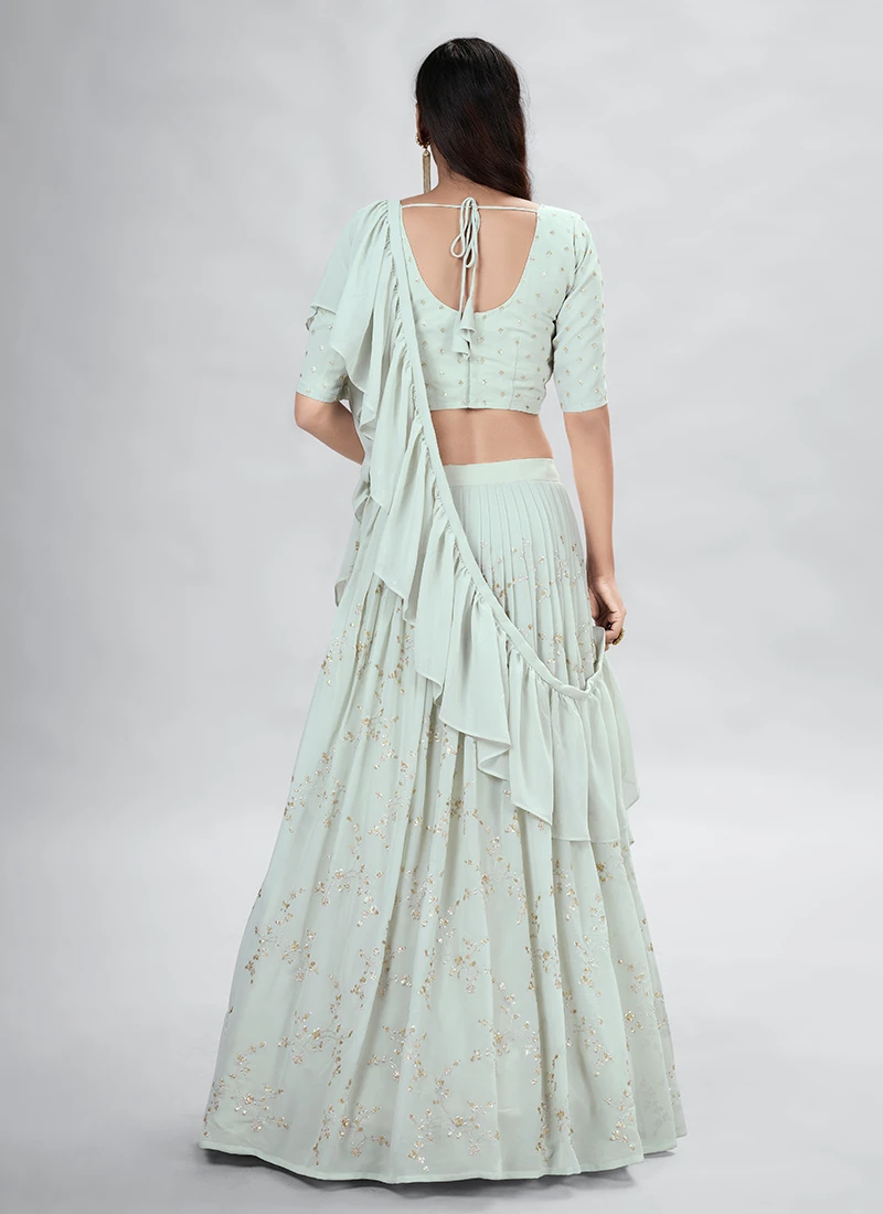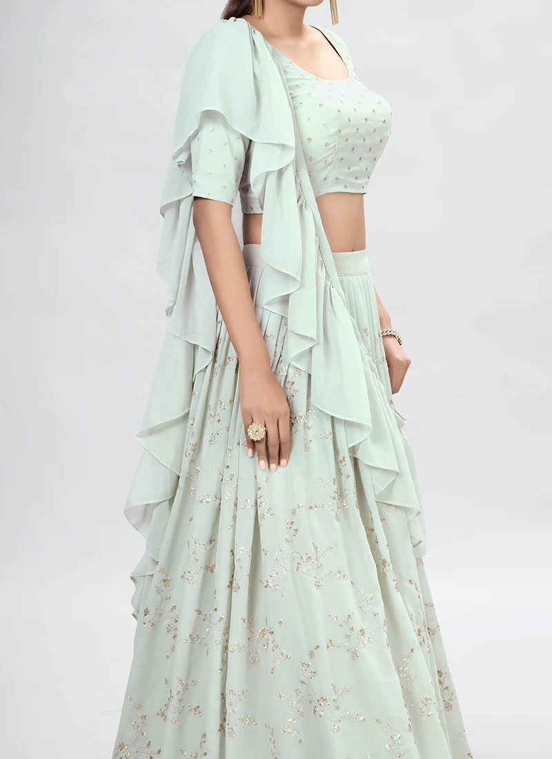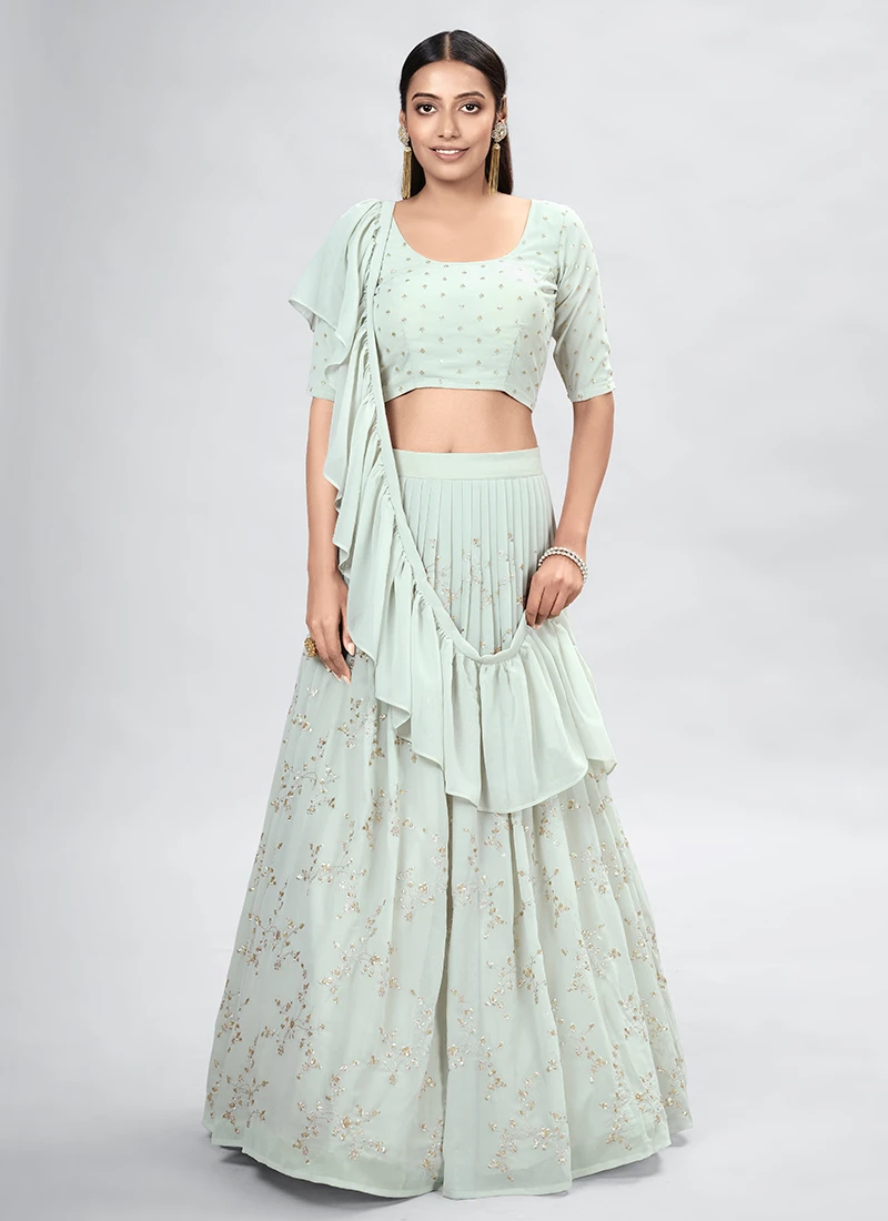 Comes with semi -stitched lehenga, un stitched choli and dupatta fabric. To have it stitched, please select the custom tailoring options. Lehenga with elaborate patterns and colors are used for photo-shoot. Color and pattern of the lehenga might not be as shown in the image.