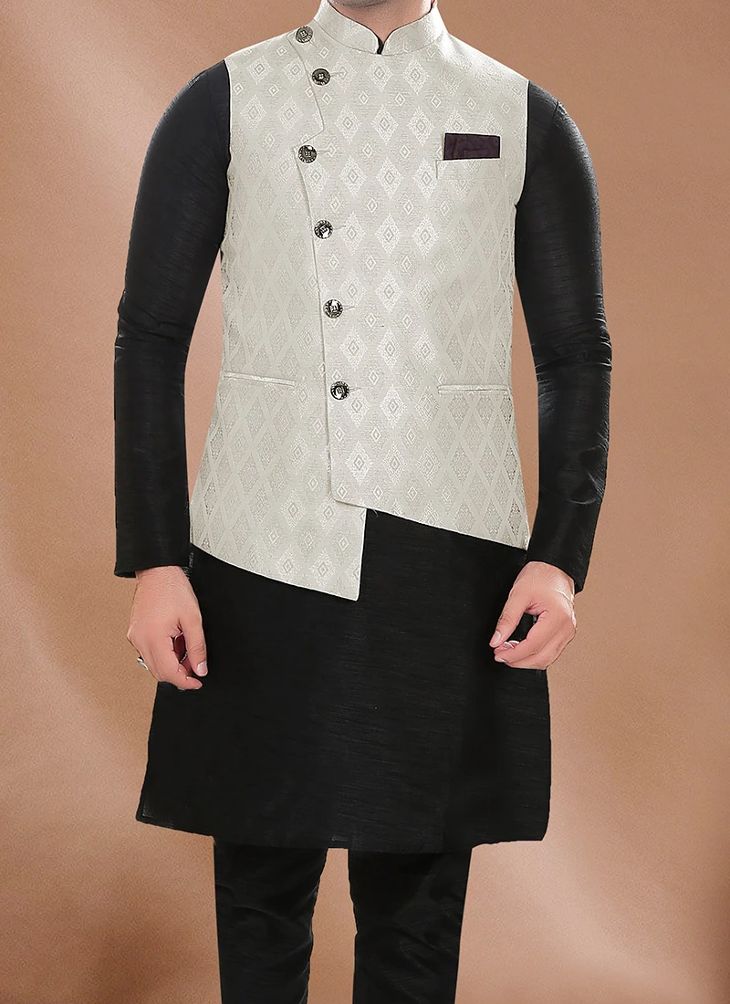 In summary the Light Grey Art Silk Jacquard Bandhgala Jacket is a timeless piece that seamlessly blends traditional Indian craftsmanship with contemporary fashion sensibilities. Its exquisite design luxurious fabric and impeccable tailoring make it a musthave addition to any discerning gentlemans wardrobe allowing you to make a lasting impression wherever you go.