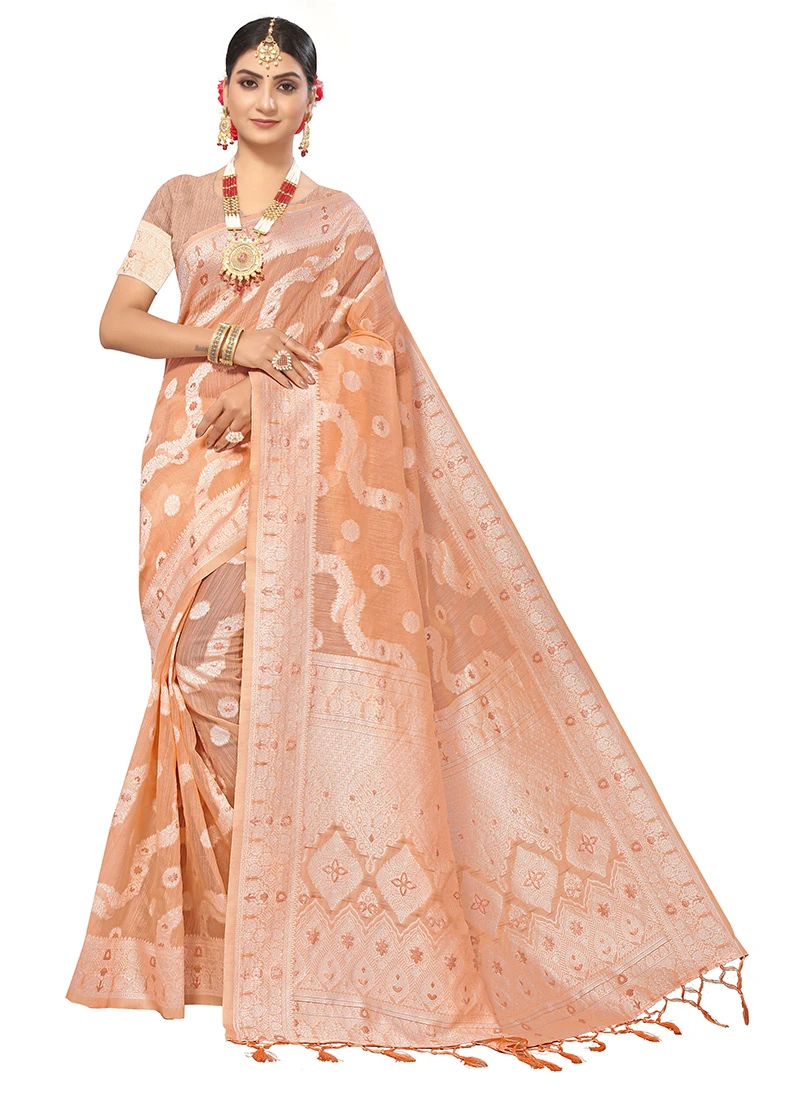 Be the moon that shines even in the dark when you look in this light peach color cotton saree. This saree comes with woven work all over the attire and tassels looks chic and ideal. This saree comes with unstitched light peach color cotton blouse.