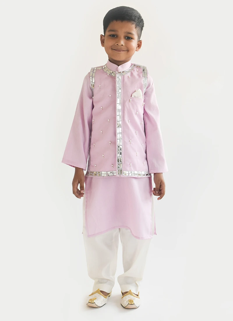 Design and style would be at the peak with this lilac cotton silk kids boys bandi set crafted with close collar neck and full sleeves. The stunning plain work throughout the attire is awe inspiring. This bandi set comes with white cotton silk chudi style pant bottom and lilac cotton silk embroidery jacket.