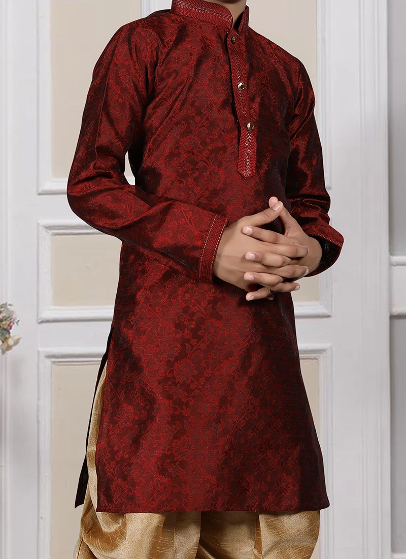 You will be the centre of attention in this maroon color art silk kids boys kurta pyjama enriched with brocade work over the kurta and crafted with collar neck and full sleeves is representing a royalty in itself. Comes with golden color art silk dhoti b