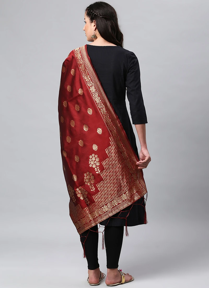 Maroon benarasi silk dupatta with traditional motifs designs jacquard woven work all over the dupatta with tassels in the end.