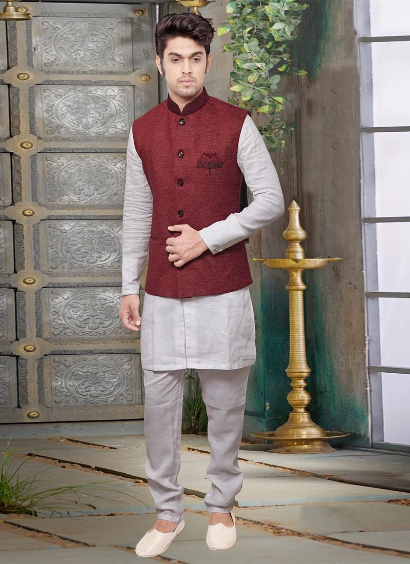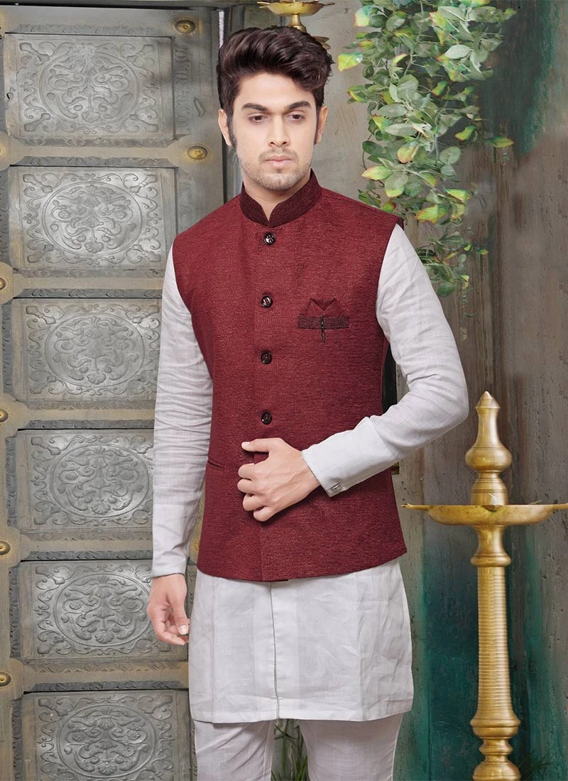 Maroon jute solid textured nehru jacket with side square pocket on it.