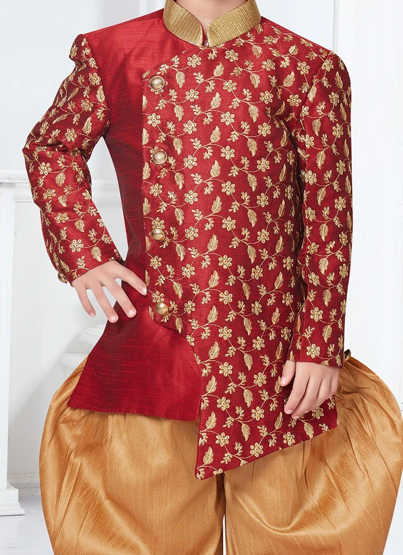 Your special days will trend up with this maroon silk fabric indowestern sherwani with jacquard work makes more attractive crafted with collar neck and full sleeves. This sherwani comes with chikoo silk dupion dhoti bottom.