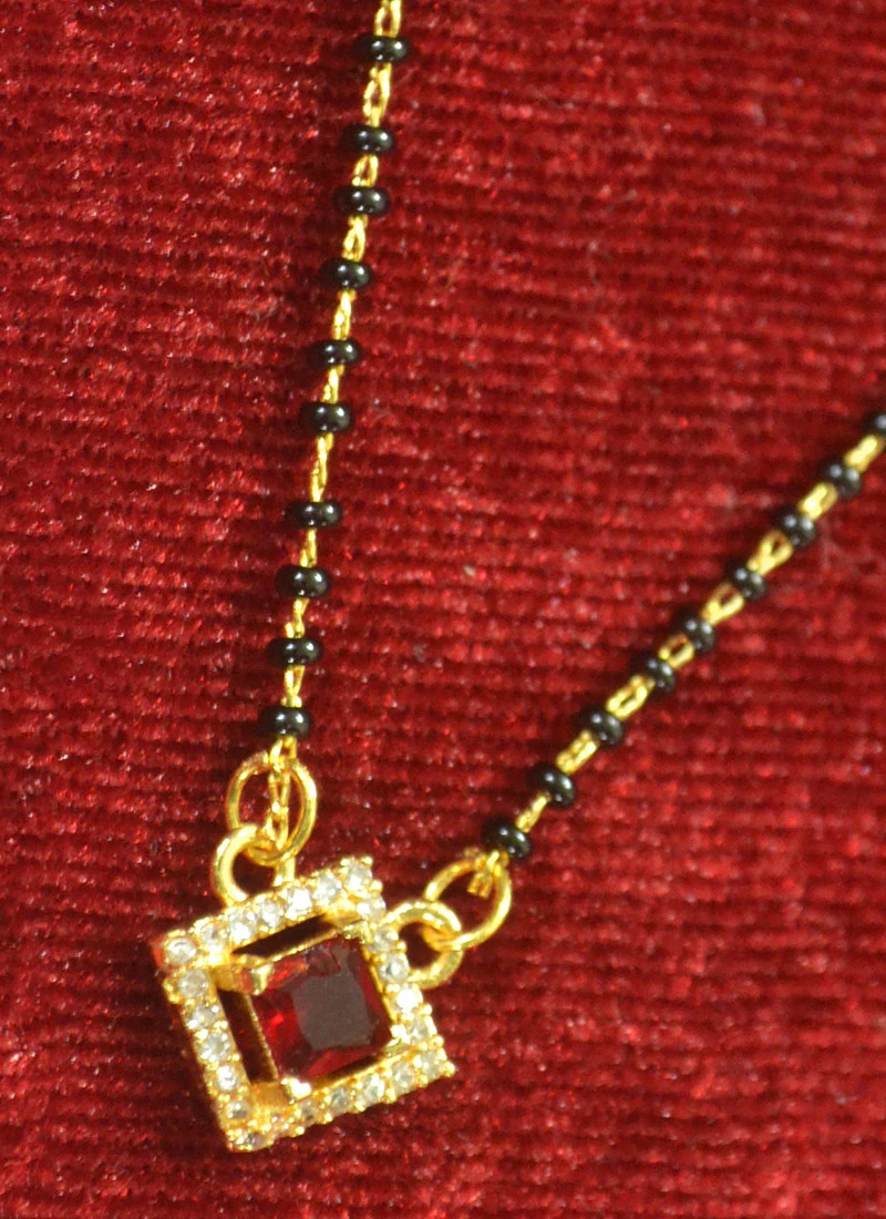 Golden Plated long traditional mangalsutra decorative with maroon n white stones work with simple one line chain with black beads.