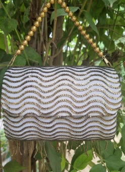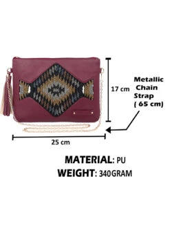 This maroon color velvet designer clutch hand embroidered with zardosi and Pearl work on one side and comes with long sling chain.