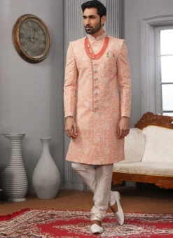 Coral Peach Art Silk Lucknowi Embroidered Angrakha Sherwani Party Wear
