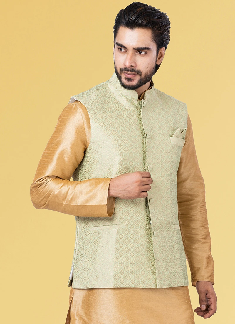 Outstanding craftmanship of exhibited in this mint green jacquard silk nehru jacket crafted with mandarin collar neck and sleeveless enriched with jacquard work is representing royalty in itself.