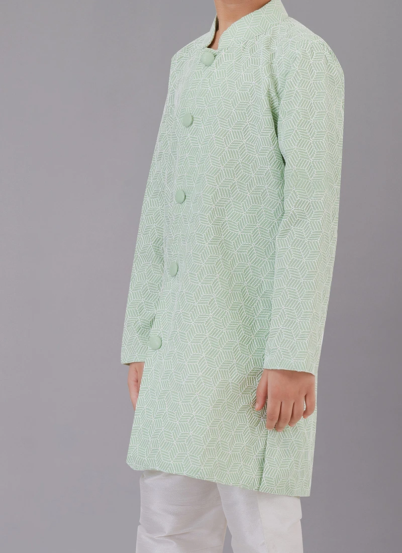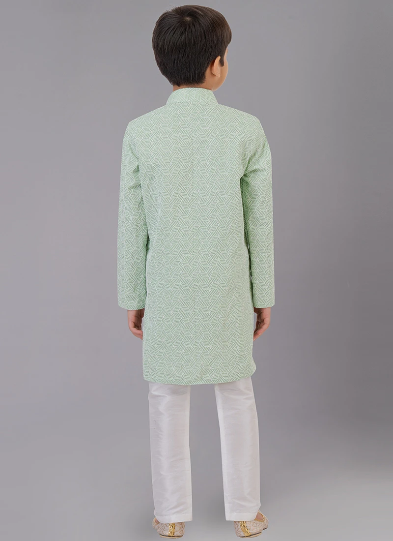 Mint Green Silk kids boys kurta pyjama beautified with embroidered work over the kurta and crafted with collar neck and full sleeves looks great. Comes with white banarasi dupion silk chudi pant bottom.