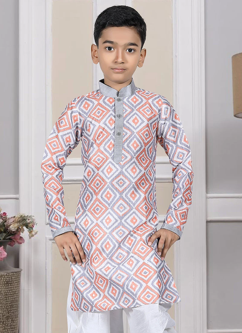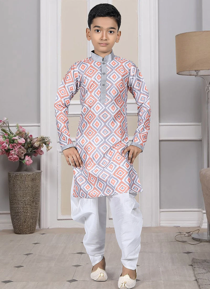 Look amazing with the attachment of multicolor art silk kurta pyjama enriched with printed work over the kurta and crafted with collar neck and full sleeves look desirable. Comes with cream color art silk dhoti bottom.