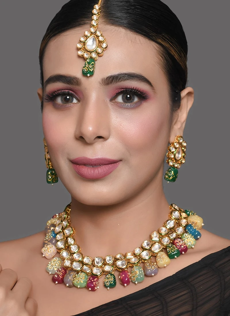 Note:The necklace is length is 24 inch, width is 1 inch N earring length is 1.5 inch, width is 0.7 inch and mangtikka length is 5.9 inch, width is 1.5 inch