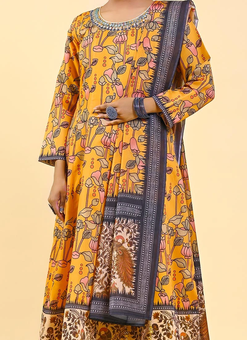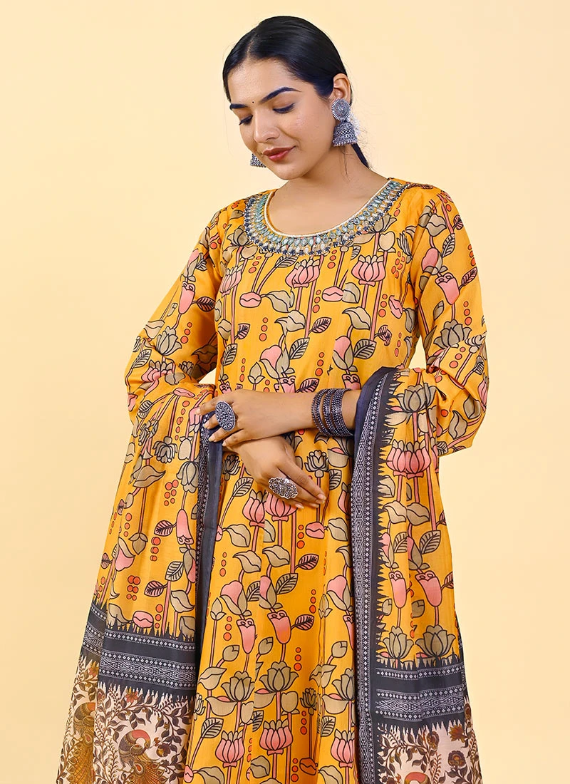 Art silk also known as artificial silk or satin silk is a synthetic fabric that mimics the feel and appearance of pure silk. What sets it apart is its lustrous surface and inherent smoothness making it an ideal canvas for intricate prints and designs. The Mustard Art Silk Printed Dresses and Gowns feature this luxurious fabric ensuring a comfortable and flattering fit. Whether youre attending a grand gala or a casual evening gathering the soft flowing texture of art silk effortlessly drapes around your body exuding grace and opulence.