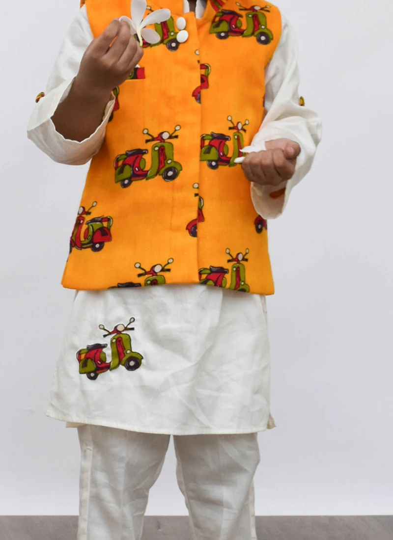 Everyone will admire you when you wear this off white color cotton silk bandi set. This attire is beautifully encrafted with plain work and jacket comes with mustard cotton with scooter printed work nehru jacket. This bandi set comes with off white cotton silk pant bottom.