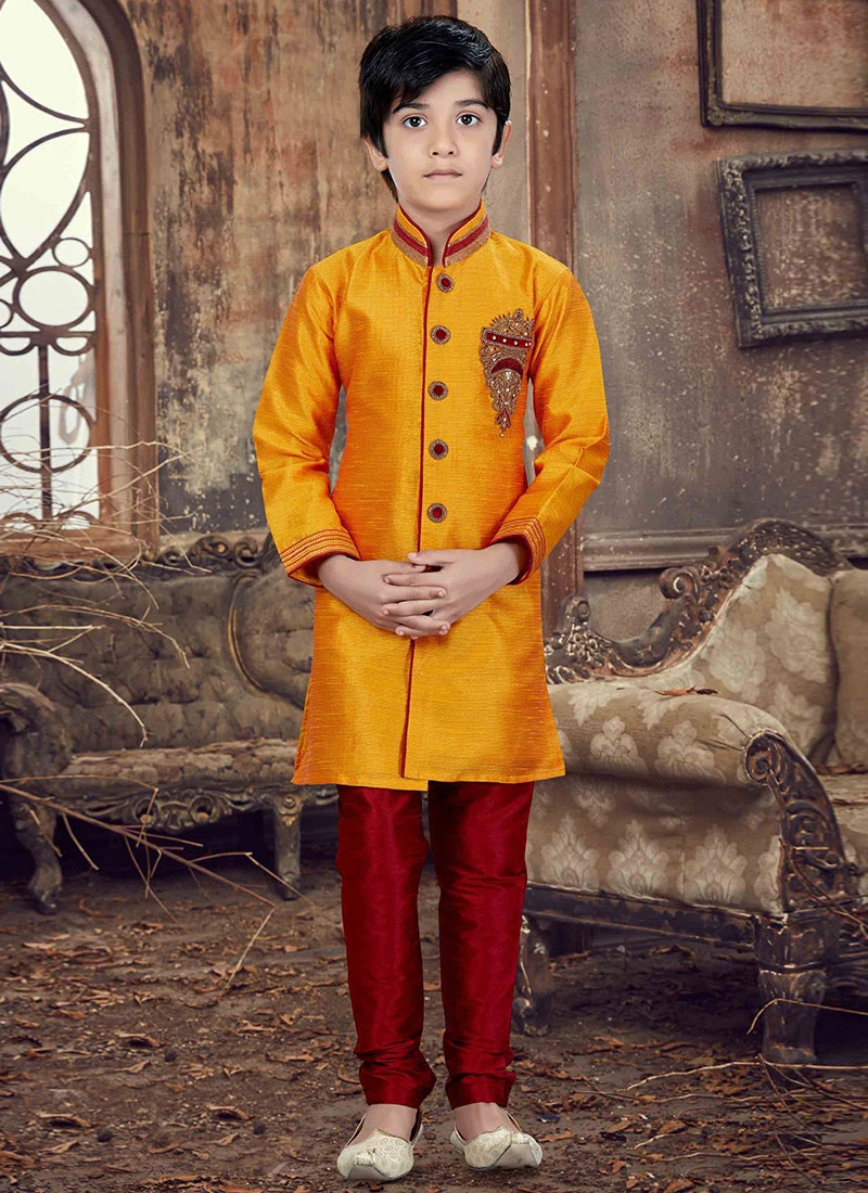 Mustard art silk kids kurta pyjama set with stone works enhancing the embroidered foliage motif on the yoke. Comes with matching maroon bottom.