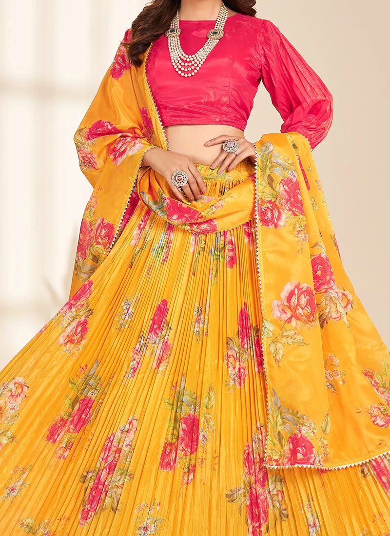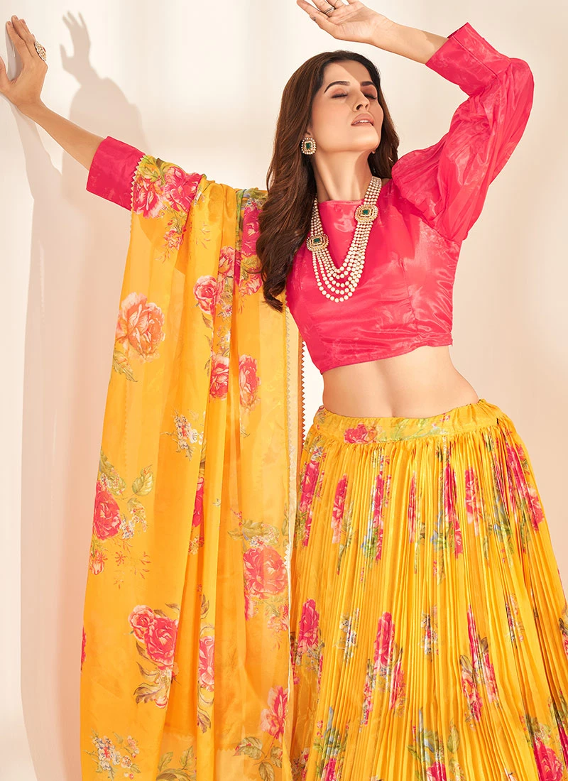 This Mustard Organza Digital Print Umbrella Lehenga is a testament to the rich heritage of Indian craftsmanship and textile artistry. Its vibrant color intricate prints and flattering silhouette make it a statement piece for women who appreciate traditional aesthetics with a contemporary twist. Whether worn at weddings festive gatherings or cultural events this lehenga is bound to make the wearer stand out leaving a lasting impression on onlookers. Embrace the beauty of Indian ethnic wear with this exquisite lehenga and let your style do the talking at every occasion.