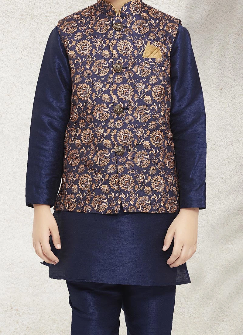 Looking amazing with attachment of navy blue art banarasi silk boys bandiset will make you stylish and graceful. It plain work crafted with full sleeves and collar neckstyle looks chic and ideal for any affair. This set comes with navy blue art banarasi silk chudi bottom and navy blue banarasi silk with printed work nehru jacket.