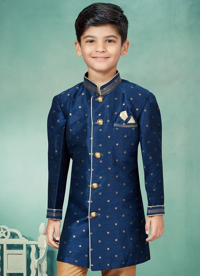 Add style to your boy towards the appearance in this navy blue art silk boys indowestern sherwani enriched with butti work over the sherwani crafted with full sleeves and mandarin collar neckstyle is representing a royalty in itself. This sherwani comes with chikoo silk dupion chudi pant bottom.ith chikoo silk dupion chudi pant bottom.