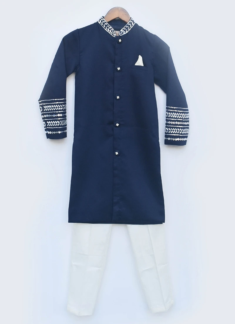 Style and design and pattern will be at the peak with this navy blue cotton silk boys classic sherwani enriched with printed work over the kurta crafted with full sleeves and mandarin collar neckstyle is representing a royalty in itself. This sherwani comes with white cotton silk straight pant bottom.