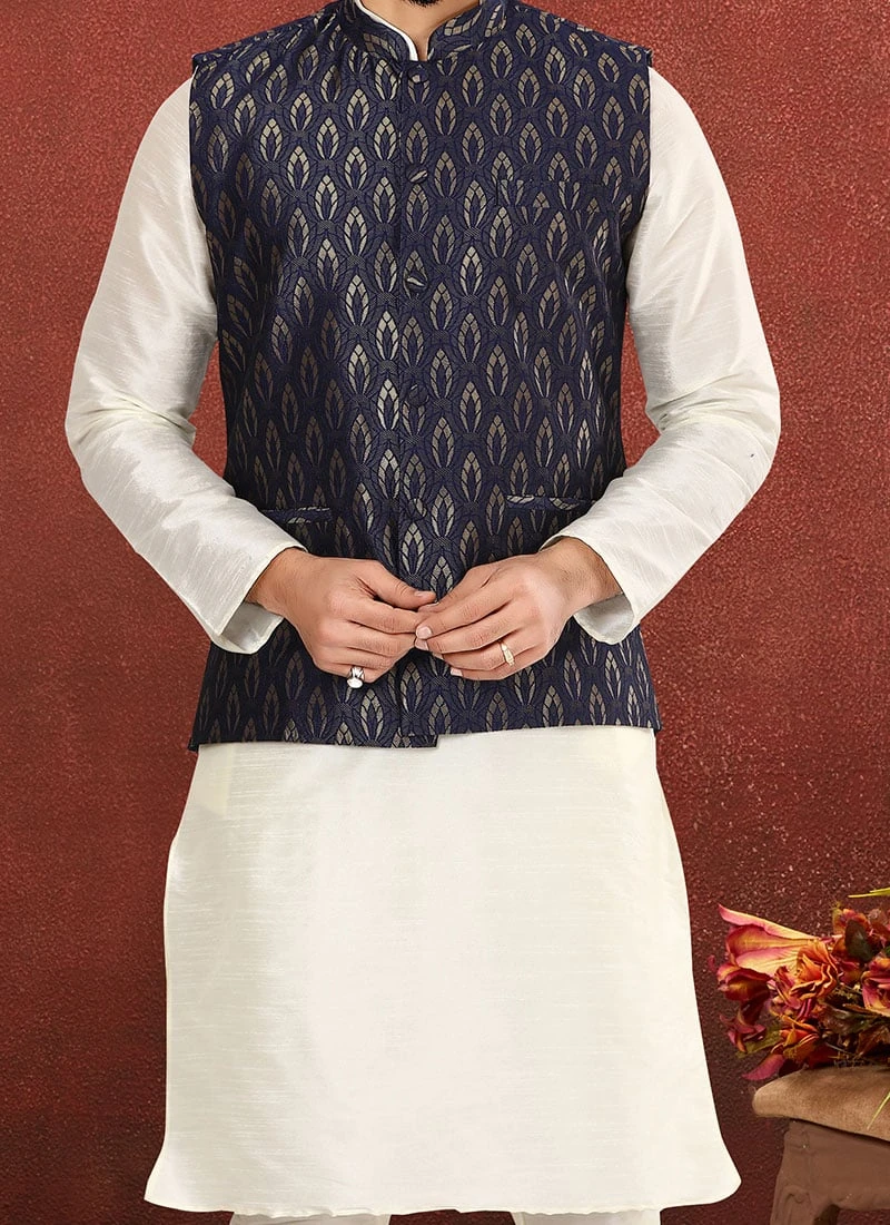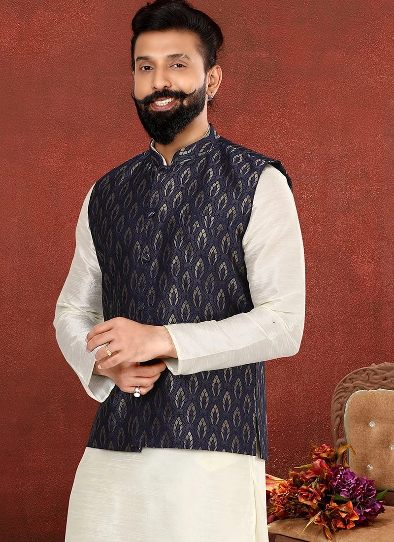 Men splendor is magnified tenfold with this navy blue color nehru jacket made up of jacquard silk fabric. The different designs jacquard work crafted with mandarin collar neck and sleeveless gives a considerable characteristic.
