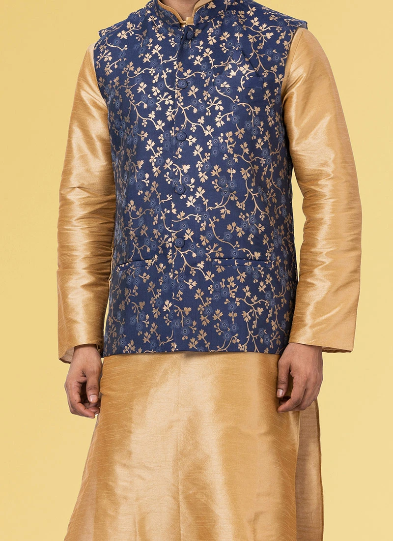 True style will come out of your dressing style and design with this navy blue jacquard silk nehru jacket crafted with mandarin collar neck and sleeveless enriched with jacquard work is representing royalty in itself.