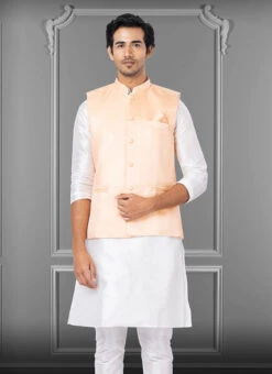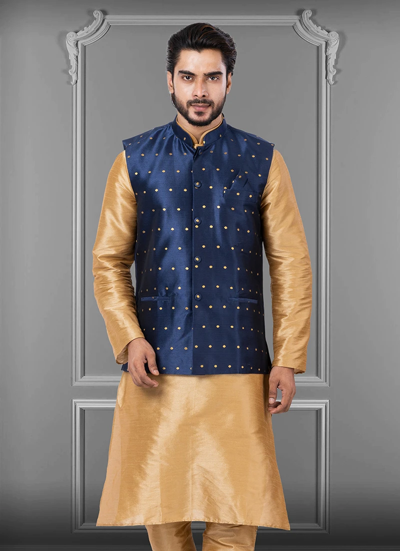 Add the sense of beauty by this navy blue mulberry butti nehru jacket crafted with mandarin collar neck and sleeveless enriched with zari work is representing royalty in itself.