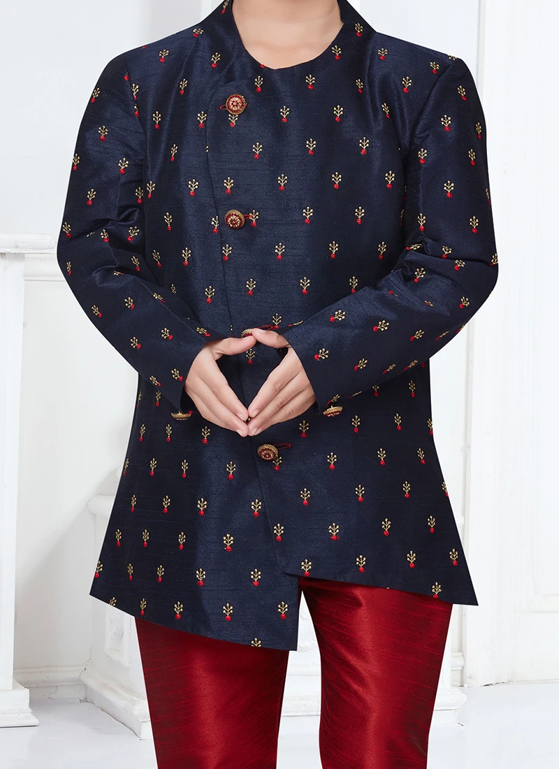 Outstanding craftmanship of exhibited in this navy blue silk fabric indowestern sherwani with jacquard work makes more attractive crafted with collar neck and full sleeves. This sherwani comes with maroon silk dupion chudi pant bottom.