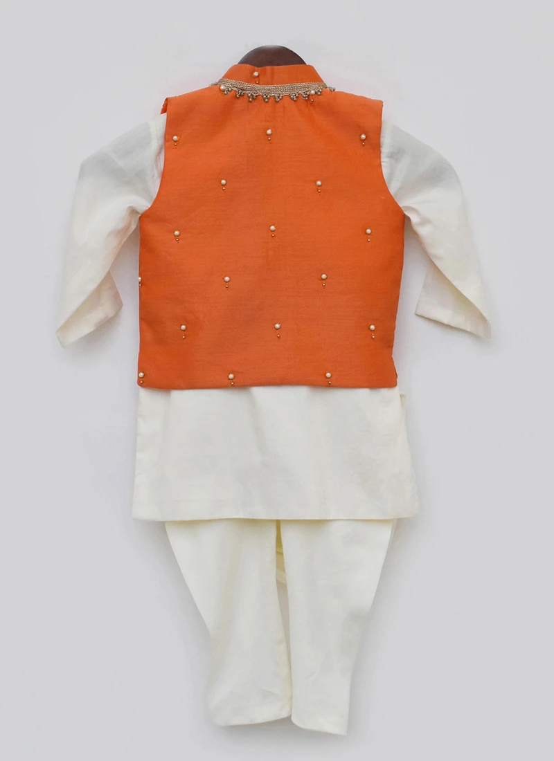 Be fasionable your boy in this off white cotton silk cowl kurta boys bandi set will make you stylish with full sleeves and mandiran collar neckstyle looks chic and ideal for any affair. This set comes with off white cotton silk chudi pant bottom and with orange cotton silk with embroidered n beads work nehru jacket.
